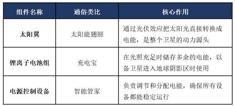 目前主流的方案是 “太阳电池阵 + 蓄电池组” 的联合供电模式,主要由三大部件组成: