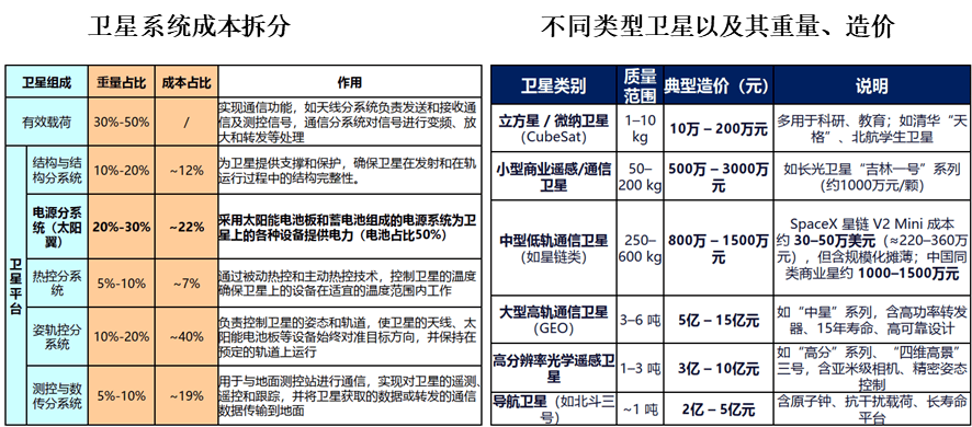 电源系统是卫星在太空持续运行的能量基础,它的重量能占到卫星总重量的 30%,成本约占整星的 22%。其中光伏电池的成本占比超过 50%,是决定卫星供电能力和功率大小的核心部件。