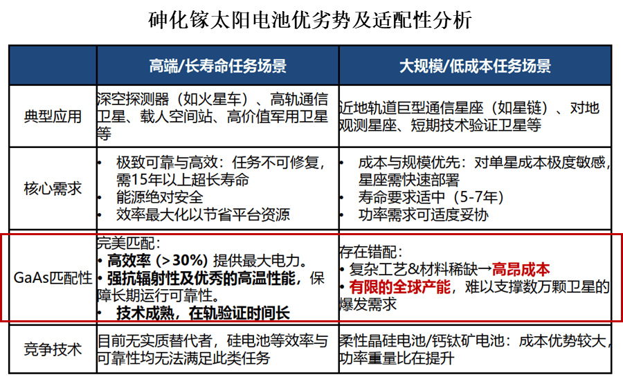 不过在追求大规模部署的卫星星座项目中,砷化镓的高成本与有限产能成为明显短板,这也为钙钛矿等低成本光伏技术提供了竞争机会。