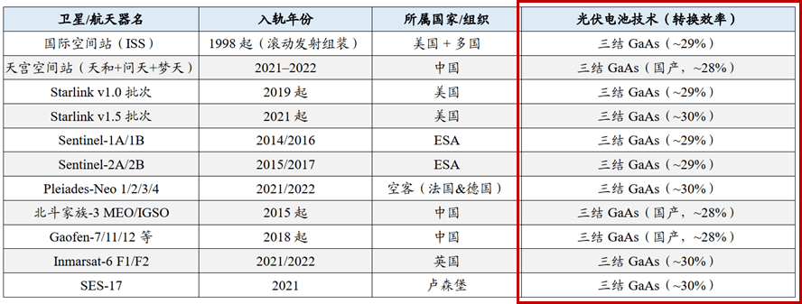 砷化镓电池是当前全球主流航天平台的首选技术方案。国际空间站与我国天宫空间站均采用三结砷化镓电池,效率达 28%-30%,已实现多年稳定运行。