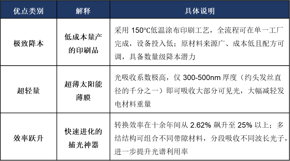 钙钛矿技术实现了极致降本与效率跃升的双重突破。它的制备路径和传统晶硅、砷化镓电池完全不同,采用 150℃的低温涂布印刷工艺,整个生产流程都能在同一家工厂完成,大幅降低了设备投入成本;同时原材料来源广、价格低,配方还能灵活调整,具备数量级的降本潜力。