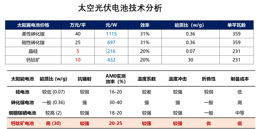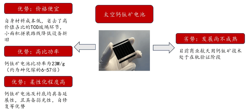 钙钛矿电池凭借轻量化、高能质比、低成本及稳定性优势,有望成为太空供电终极解决方案。总的来说,其优缺点如下: