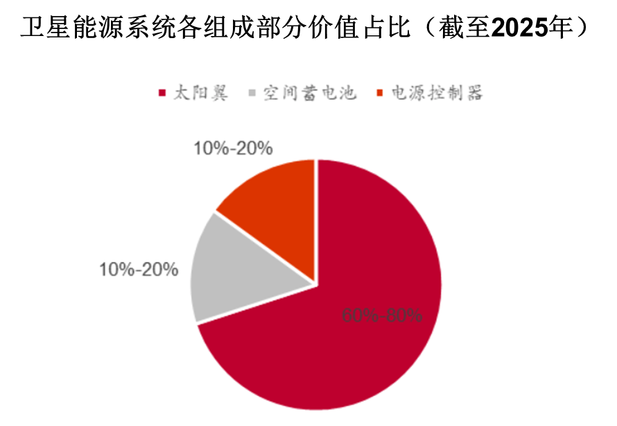 在卫星电源系统中,太阳翼的价值通常占 60% 到 80%,其价值量远高于锂离子电池组与电源控制设备。