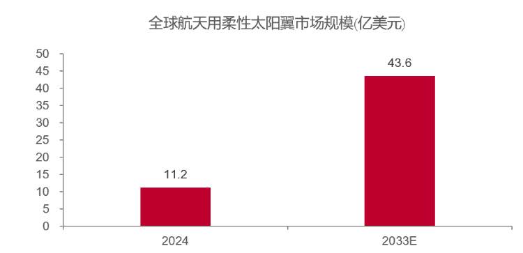 全球柔性太阳翼市场正处于快速扩张阶段。根据 Market Intelo 的报告,2024 年全球航天用柔性太阳翼市场规模约 11.2 亿美元,预计到 2033 年将增至 43.6 亿美元,年复合增长率约 16.4%。
