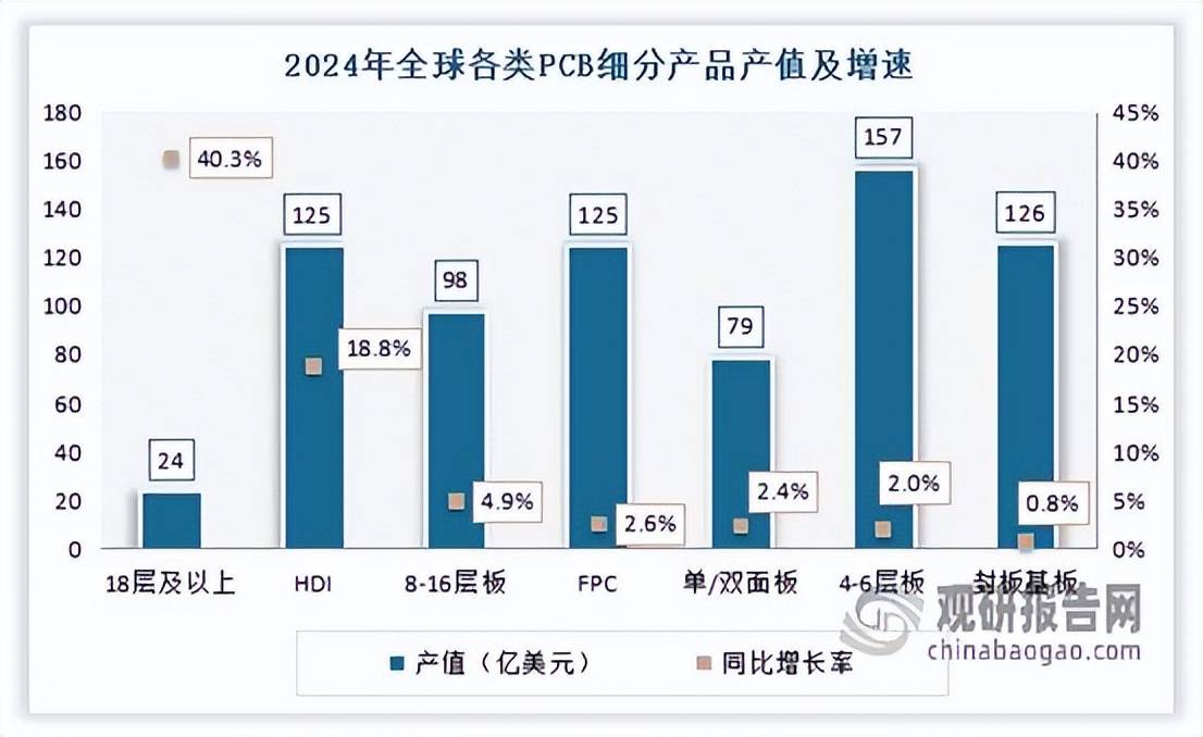 当下,基于AI驱动的算力基建需求激增、消费电子的AI创新周期开启,叠加汽车智能化、高速网络等应用领域不断拓展,印制电路板(PCB)需求得到明显增长,其中HDI和高多层板等高端印制电路板(PCB)产品的需求尤为强劲。数据显示,在2024年全球各类印制电路板(PCB)细分产品中,18层及以上的多层板产品产值增速最高,达到40.3%;其次为HDI,同比增长18.8%。